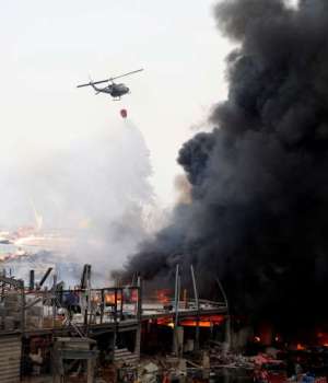 Live television footage showed one helicopter flying to the area, with a water container slung underneath. The blaze erupted a little more than a month after a huge explosion devastated the port and surrounding area.
